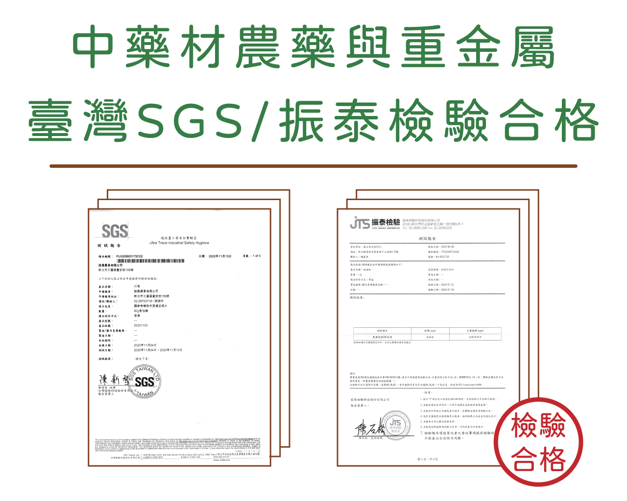 我們的中藥品、原料與包材的供應商皆通過 SGS 與 振泰 等獨立第三方檢驗機構的驗證。SGS 是全球領先的測試、檢驗與驗證公司,被公認為品質與誠信的標竿;